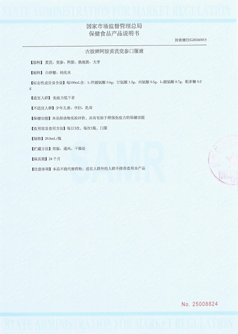 近日,东阿古胶传来重磅喜讯,公司自主研发的新产品古胶牌阿胶黄芪党参口服液成功获得国家市场监督管理总局颁发的国产保健食品注册证书。这一成果不仅是对企业研发实力与生产规范的官方权威认可,更是东阿古胶在中医药健康领域深耕细作、持续创新的重要里程碑,为企业高质量发展注入了强劲动力。