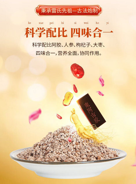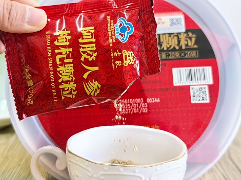 在原料配伍上,这款颗粒延续了中医 “药食同源” 的传统理念,阿胶、人参、枸杞与大枣的组合并非随意搭配。人参与枸杞作为中华本草中极具代表性的食材,在古籍中早有各自的养生渊源,而类似的食材协同思路,更在历史上多种传统方剂中留下痕迹。这种注重食材特性互补的组方逻辑,让四种原料在融合中形成独特的风味与质感,既贴合传统养生文化的沉淀,又符合现代人群对天然食材搭配的偏好。