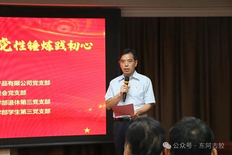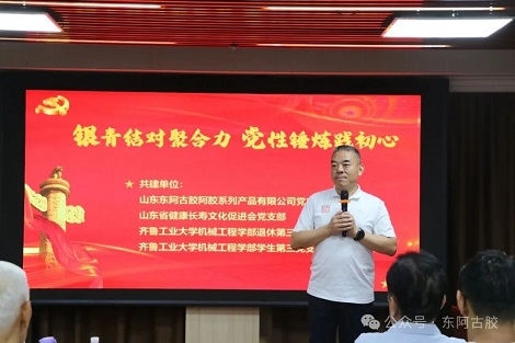 活动伊始,在公司会议室举行的开场仪式上,各方代表依次致辞。山东东阿古胶系列产品有限公司董事长雷庆涛介绍了企业传承非遗文化、践行社会责任的发展历程;山东省健康长寿文化促进会常务副会长钟爱平强调了银青结对对于传承红色基因的重要意义;齐鲁工业大学机械工程学部党委书记吴笑兵则寄语青年党员与退休老党员互帮互学,共同提升党性修养。随后,原山东省政协秘书长毕泗生以《把党性修养作为共产党人的终身课题》为题作专题报告,结合自身经历深入浅出地阐释了党性修养的核心内涵,为在场党员上了一堂生动深刻的党课。