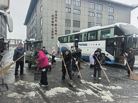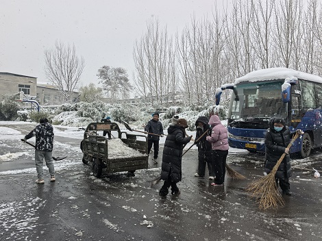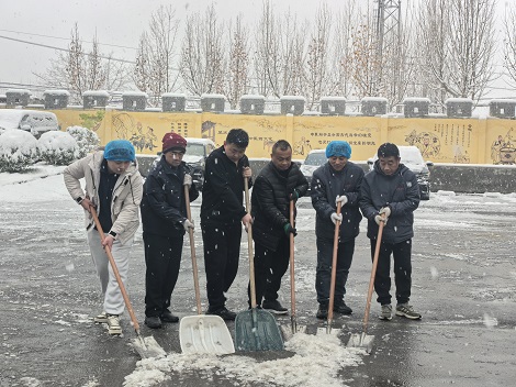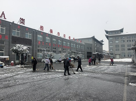 手持铁锹的员工们干劲十足,对着路面的积雪和薄冰奋力铲挖,铁锹与地面碰撞发出“哐哐”的声响,像是冬日里的奋进号角;挥动扫把的员工们动作麻利,顺着一个方向将零散的积雪归拢成堆,扫帚划过地面,扬起阵阵雪雾;开三轮车的员工则穿梭在各个区域,及时将堆积好的雪堆转运至指定空地,高效又快捷。大家各司其职、默契配合,有人负责开辟主干道,有人专注清理办公区出入口,有人守护生产车间门口的通道,没有推诿、没有懈怠,每个人都在为“自家的庭院”出力。