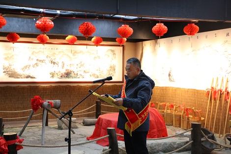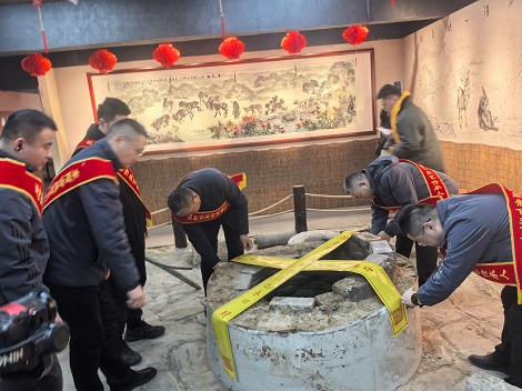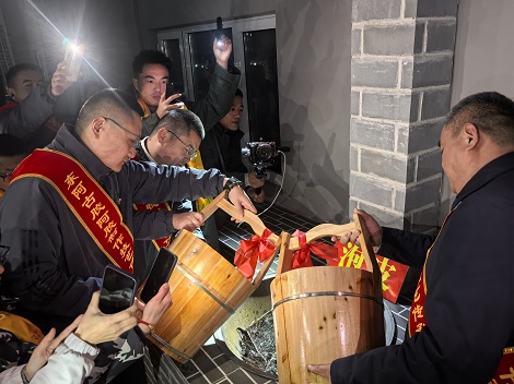 12月20日子时,古胶井前灯火通明,取水仪式率先拉开序幕。董事长雷庆涛庄严宣读《祭井文》,祈佑世人安康、阿胶文化永续传承。随后,雷总亲手揭开封条与红绸,古胶井尘封的灵气应声而启。雷总、杨总等几位领导依次用木桶汲取清冽井水,挑水队伍踏着整齐的步伐前往点火仪式,每一步都承载着对古法的敬畏。