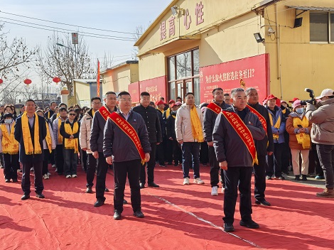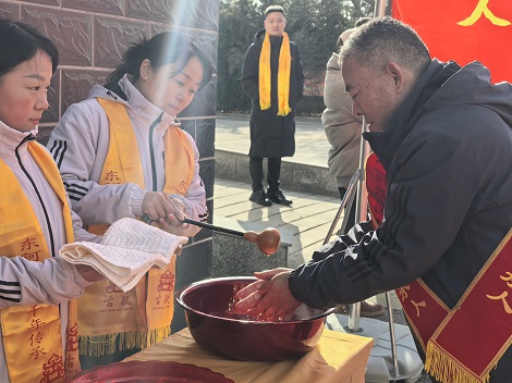 12月21日冬至当天上午,博物馆院子主舞台热闹非凡,冬至仪式环节精彩迭起。9时许,各工作组已完成物料到位与设备调试,直播团队开启预热直播,向全网观众讲述阿胶文化的深厚底蕴。员工们佩戴黄围巾整齐集结,特邀非遗文化学者、健康养生专家及核心溯源客户代表等嘉宾陆续签到,身着小毛驴服饰的工作人员热情迎宾,引导大家合影留念,现场洋溢着喜庆与庄重交织的氛围。